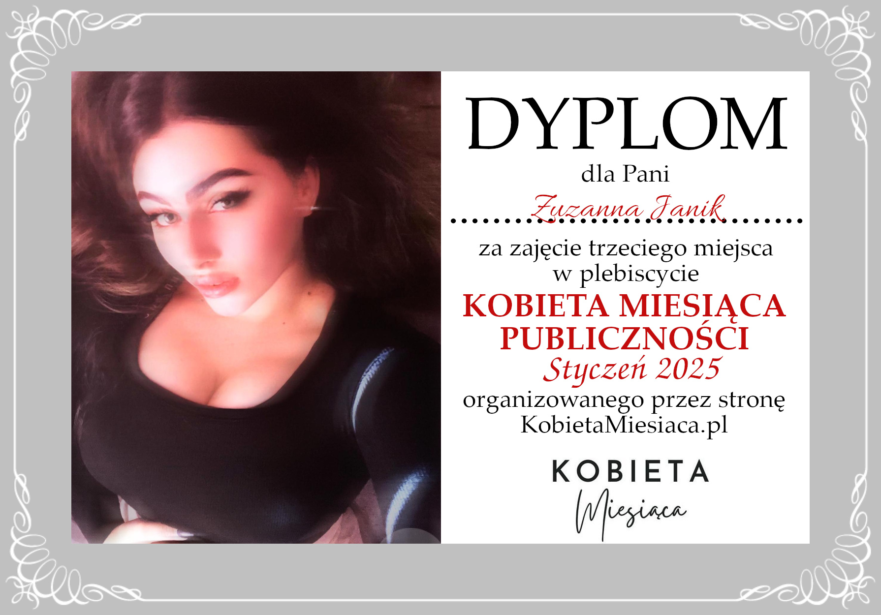 Dyplomy Dyplom – Kobieta Miesiąca Publiczności: Styczeń 2025 Autor Administrator 1 rok temu Zdobywczyni 3. miejsca – Zuzanna Janik Udostępnij tę stronę REKLAMA Nawigacja wpisu Poprzedni Dyplom – Kobieta Miesiąca: Styczeń 2025Dalej Dyplom – Kobieta Miesiąca: Styczeń 2025
