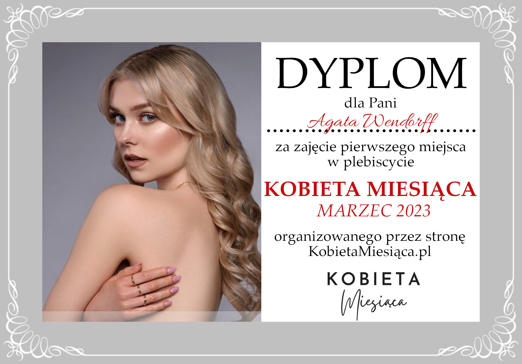 Dyplomy Dyplom – Kobieta Miesiąca: Marzec 2023 Autor Administrator 2 lata temu Zdobywczyni 1. miejsca – Agata Wendorff Udostępnij tę stronę REKLAMA Nawigacja wpisu Poprzedni Dyplom – Kobieta Miesiąca Publiczności: Luty 2023Dalej Dyplom – Kobieta Miesiąca Publiczności: Marzec 2023