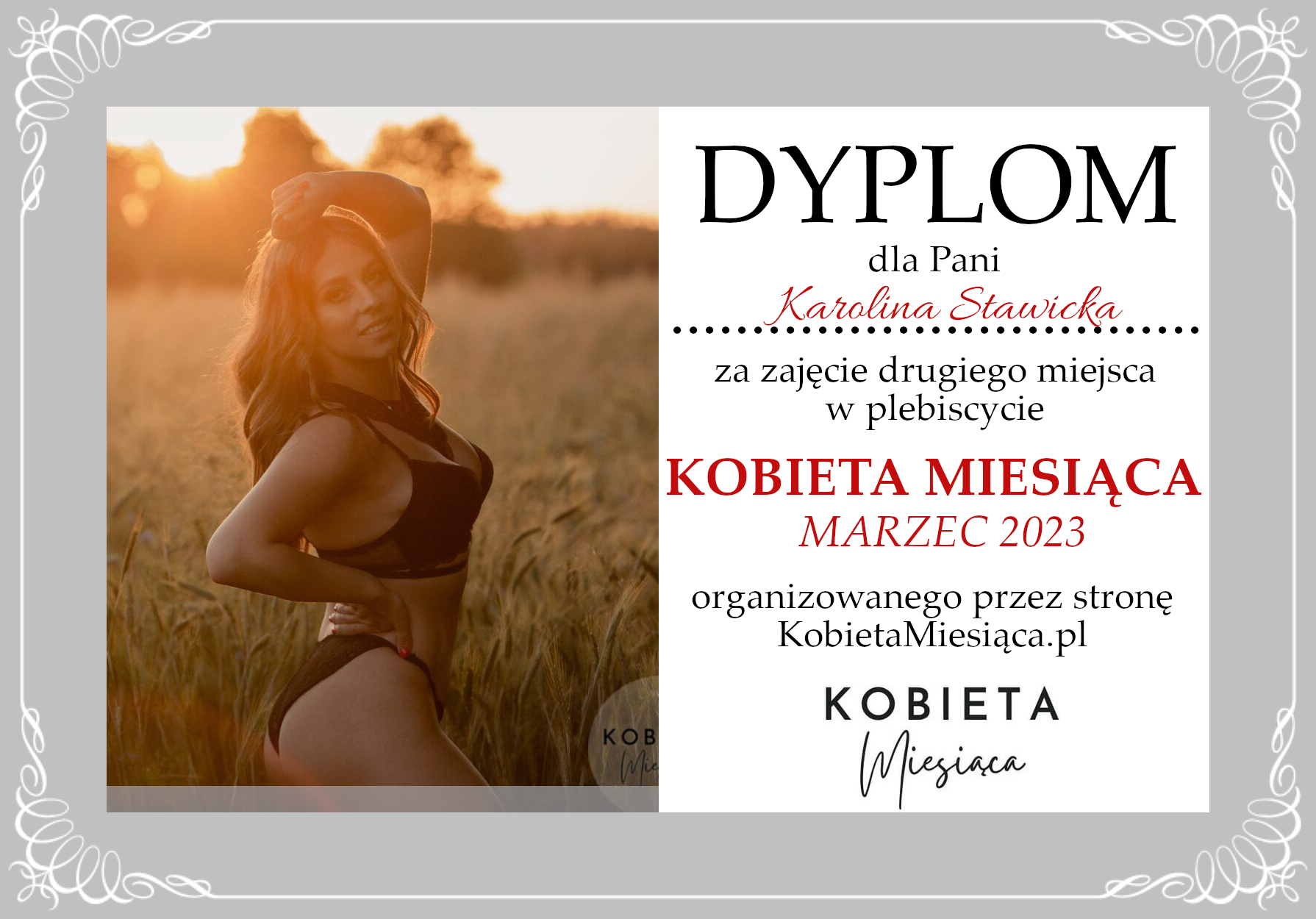 Dyplomy Dyplom – Kobieta Miesiąca: Marzec 2023 Autor Administrator 2 lata temu Zdobywczyni 2. miejsca – Karolina Stawicka Udostępnij tę stronę REKLAMA Nawigacja wpisu Poprzedni Dyplom – Kobieta Miesiąca Publiczności: Marzec 2023Dalej Dyplom – Kobieta Miesiąca Publiczności: Marzec 2023