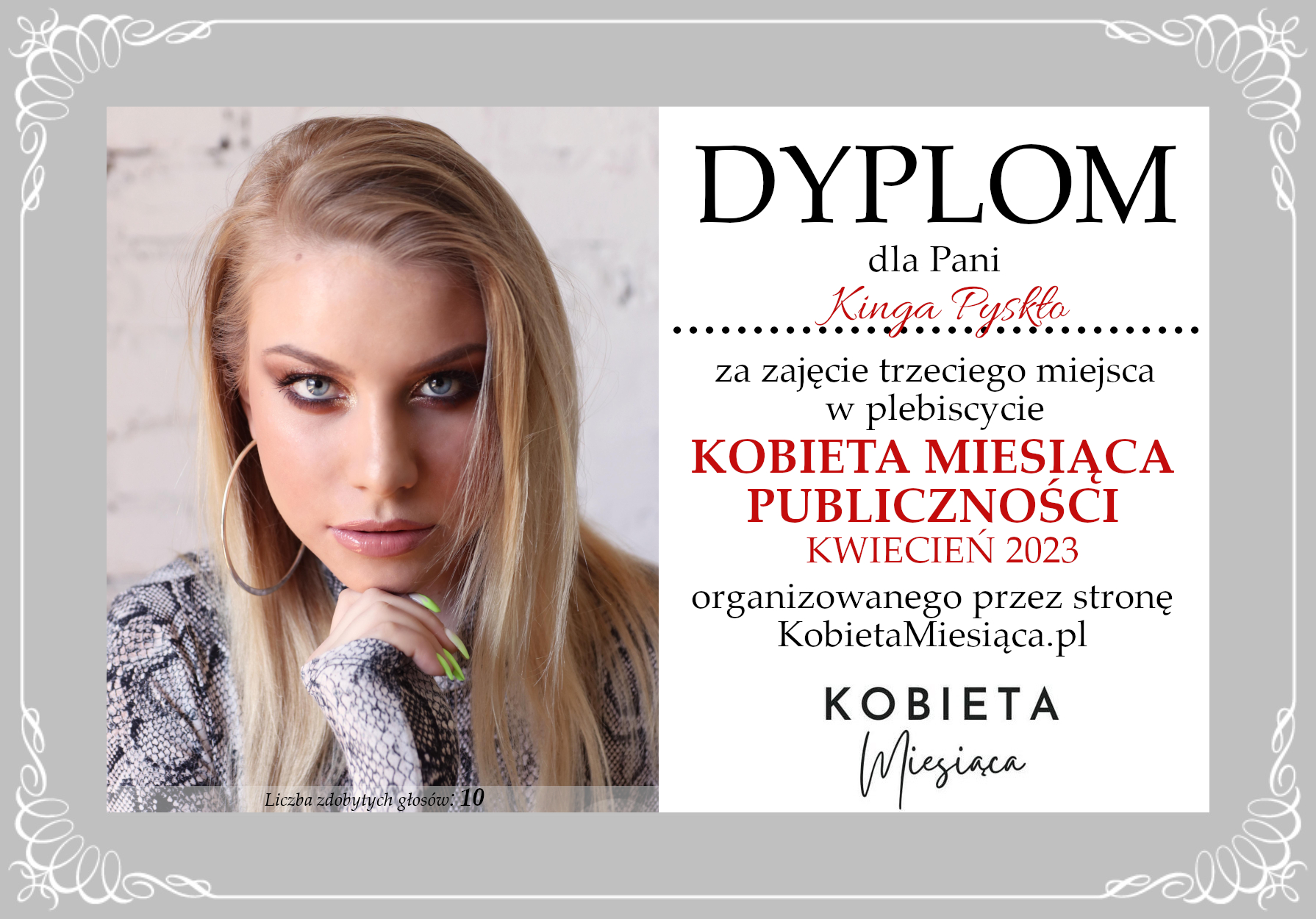 Dyplomy Dyplom – Kobieta Miesiąca Publiczności: Kwiecień 2023 Autor Administrator 2 lata temu Zdobywczyni 3. miejsca – Kinga Pyskło Udostępnij tę stronę REKLAMA Nawigacja wpisu Poprzedni Dyplom – Kobieta Miesiąca Publiczności: Kwiecień 2023Dalej Dyplom – Kobieta Miesiąca: Kwiecień 2023