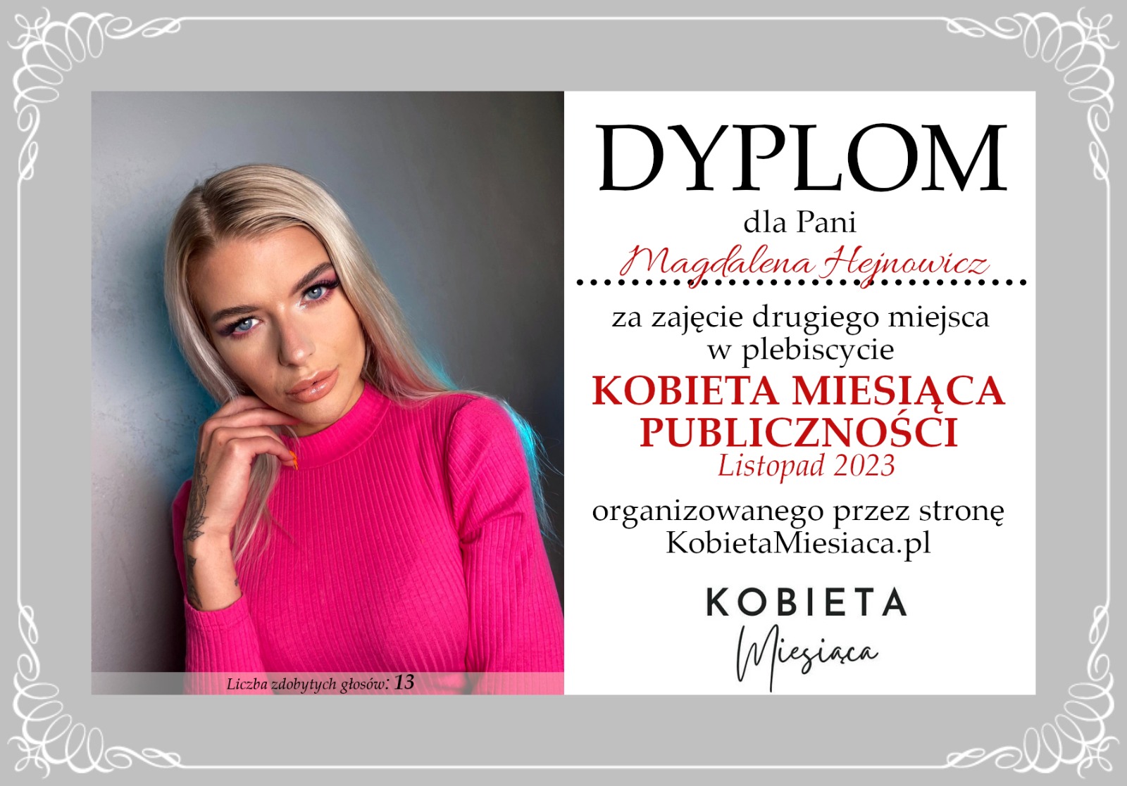 • Dyplom – Kobieta Miesiąca Publiczności: Listopad 2023