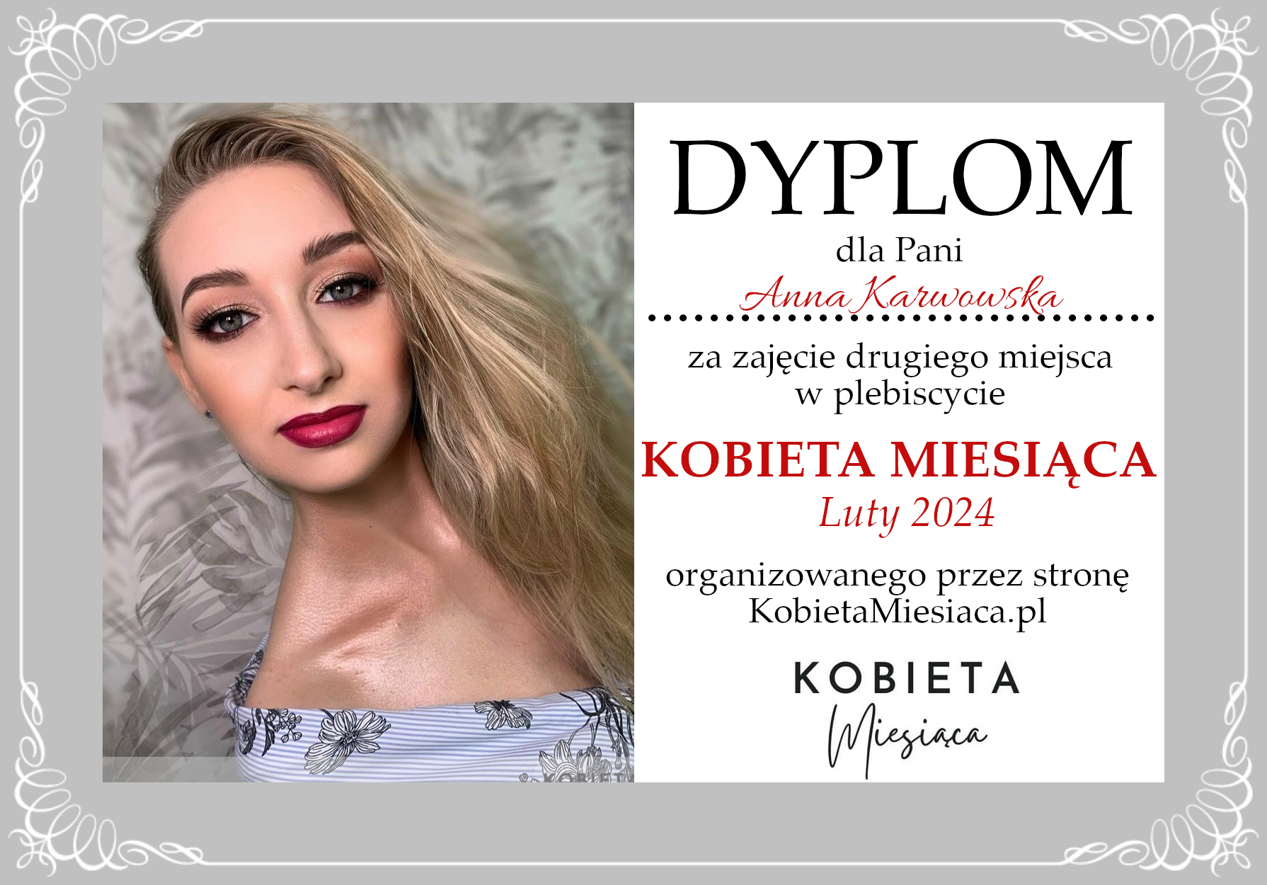 Dyplomy Dyplom – Kobieta Miesiąca: Luty 2024 Autor Administrator 2 lata temu Zdobywczyni 2. miejsca – Anna Karwowska Udostępnij tę stronę REKLAMA Nawigacja wpisu Poprzedni Dyplom – Kobieta Miesiąca Publiczności: Luty 2024Dalej Dyplom – Kobieta Miesiąca Publiczności: Luty 2024
