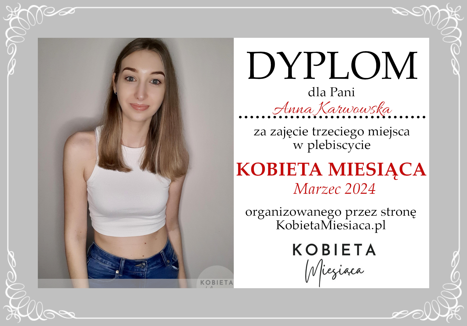 Dyplomy Dyplom – Kobieta Miesiąca: Marzec 2024 Autor Administrator 2 lata temu Zdobywczyni 3. miejsca – Anna Karwowska Udostępnij tę stronę REKLAMA Nawigacja wpisu Poprzedni Dyplom – Kobieta Miesiąca: Marzec 2024Dalej Dyplom – Kobieta Miesiąca Publiczności: Marzec 2024