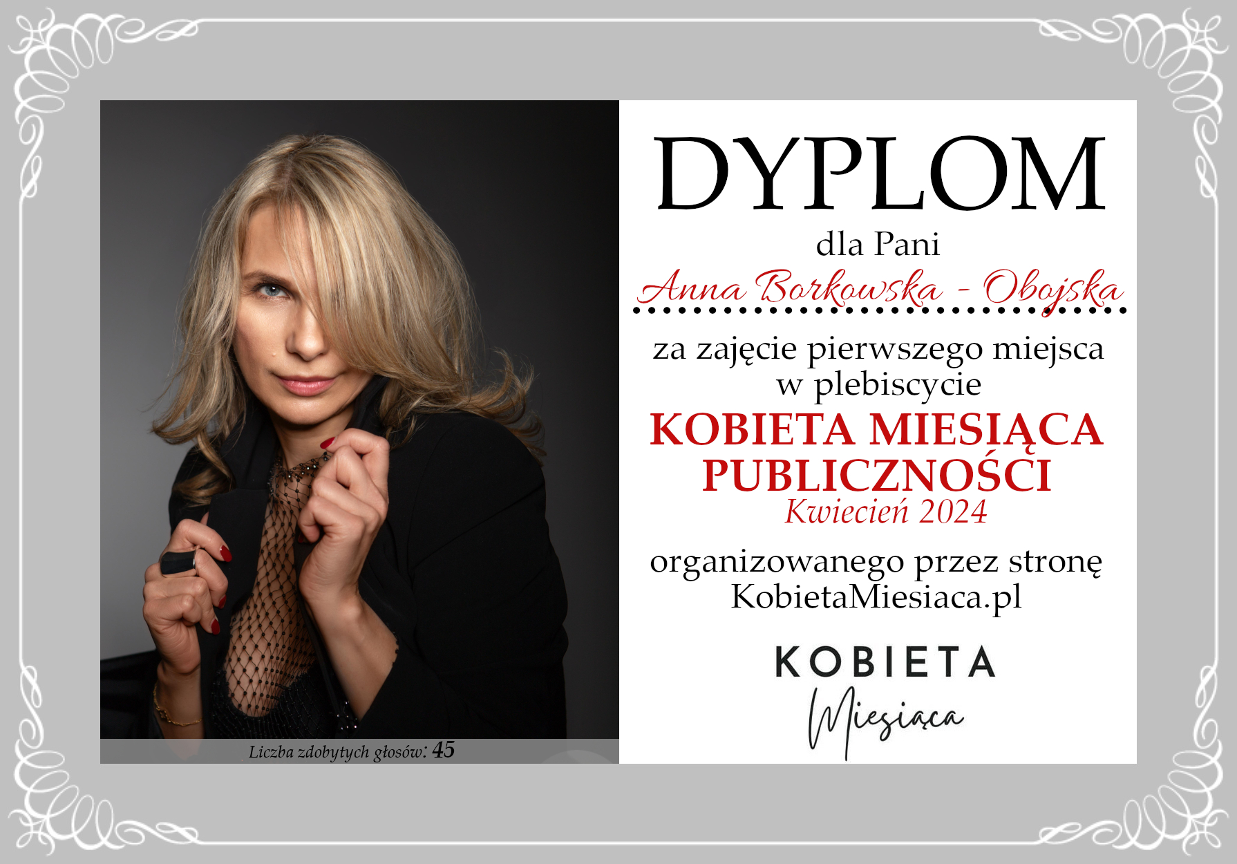 Dyplomy Dyplom – Kobieta Miesiąca Publiczności: Kwiecień 2024 Autor Administrator 2 lata temu Zdobywczyni 1. miejsca – Anna Borkowska – Obojska Udostępnij tę stronę REKLAMA Nawigacja wpisu Poprzedni Dyplom – Kobieta Miesiąca Publiczności: Kwiecień 2024Dalej Dyplom – Kobieta Miesiąca Publiczności: Kwiecień 2024